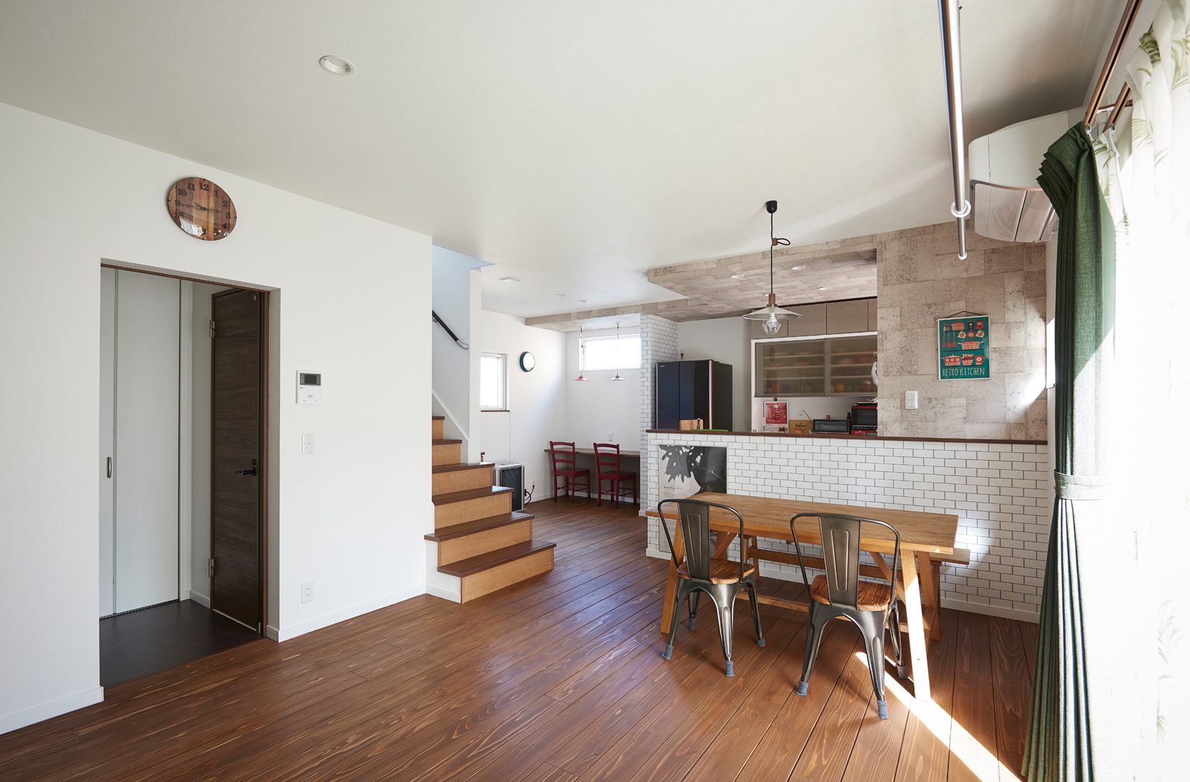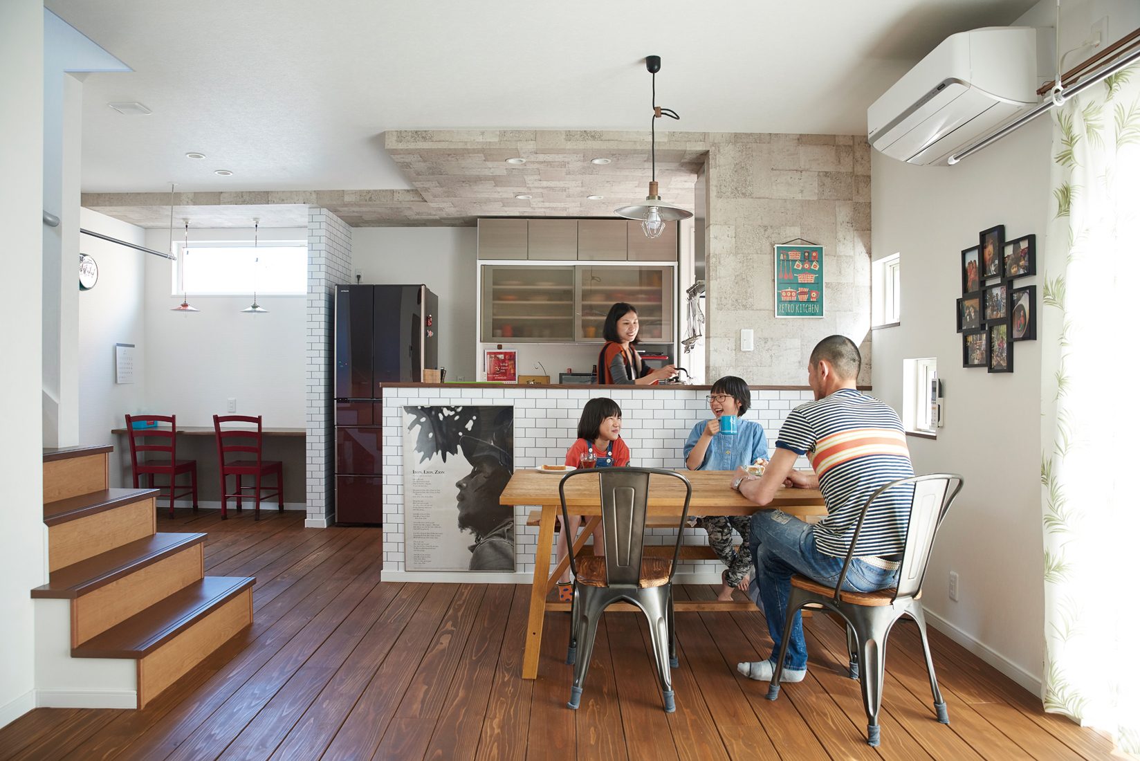 リビングをダイニングやワークスペースと仕切らず、開放感を大切にしたO邸。すっきりとした空間使いに、シンプルなデザインながら、アクセントクロス使いが印象的である。