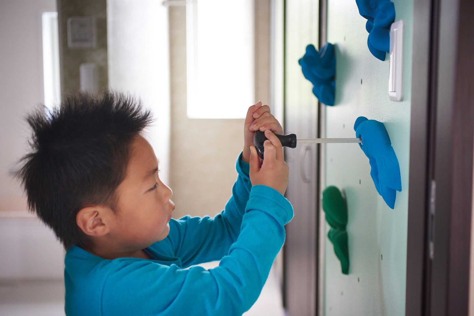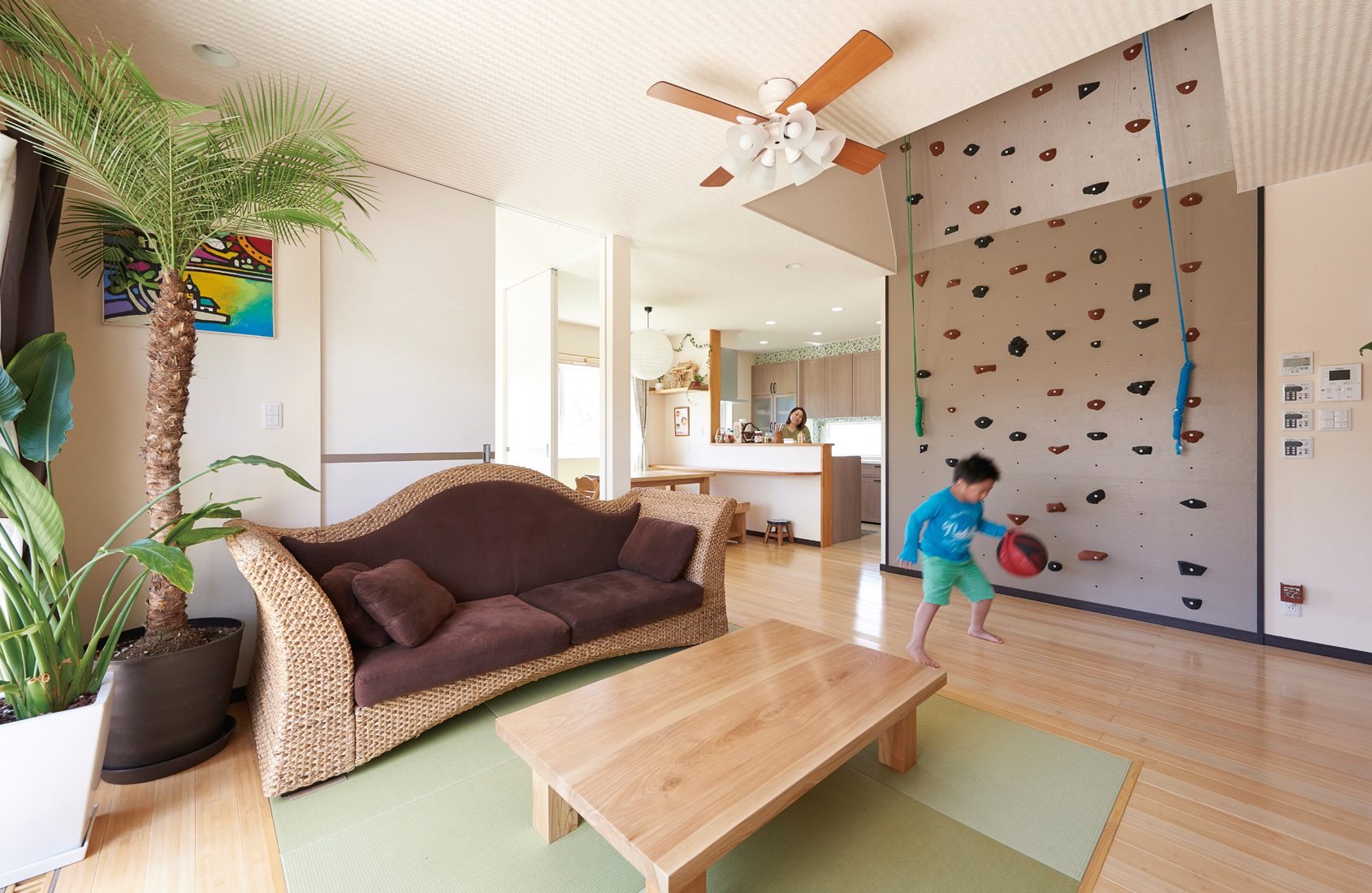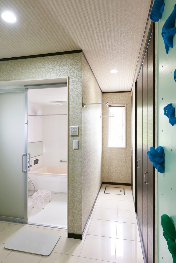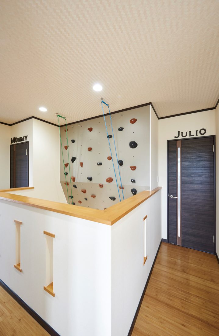 リビングに足を踏み入れると、吹き抜けまで一面に造作されたクライミングウォールに目を奪われる。ふと階上に目をやると、階段に平行したすべり台まである。まるで少年の夢をかたちにしたかのような、楽しい工夫にあふれたS邸。Sさんは「子どもたちにとって遊べる楽しい家にしたい、という思いは当初からありました。ただ、この理想をかたちにしてくれるビルダーさんとなかなか出会えなくて……。展示場を見るために、東北中を回ったんじゃないかというほど。最終的に、地元の近くで太田工業さんに出会うことができて、『こんな近くに理想のビルダーさんがいたんだ!』と驚きました」と家づくりを振り返る。