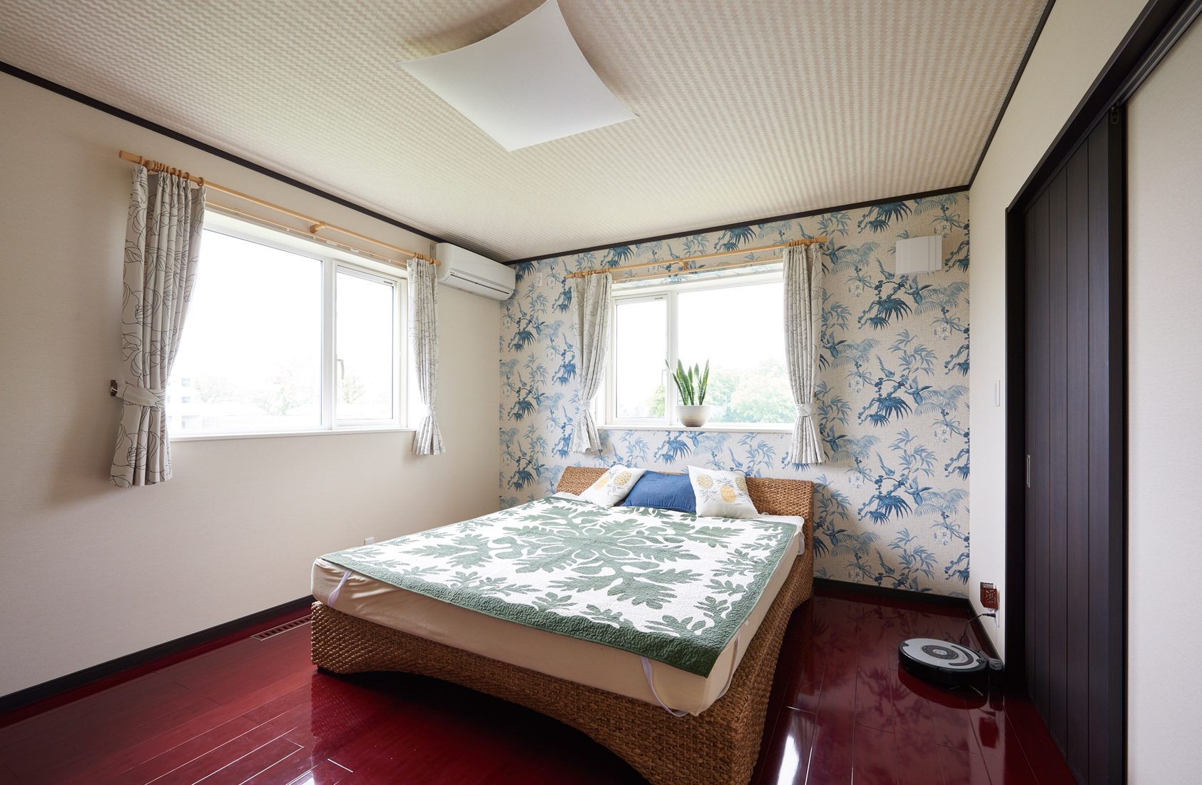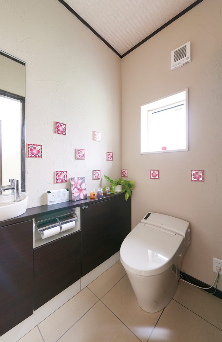 ハワイ在住歴があるというSさんらしく、ヤシの木やモンステラなどの観葉植物や、プルメリアやハイビスカスなど、ハワイを彷彿とさせるアイテムが数多く配置されている。現地で購入してきたというインテリアも多い。「建材の一つ一つに自分らしさを出すことは重視しました。細かいことにもすべて対応してもらって、理想通りの空間ができたことに大満足」と語るSさんの表情に、家づくりを存分に楽しんだ様子が感じられる。